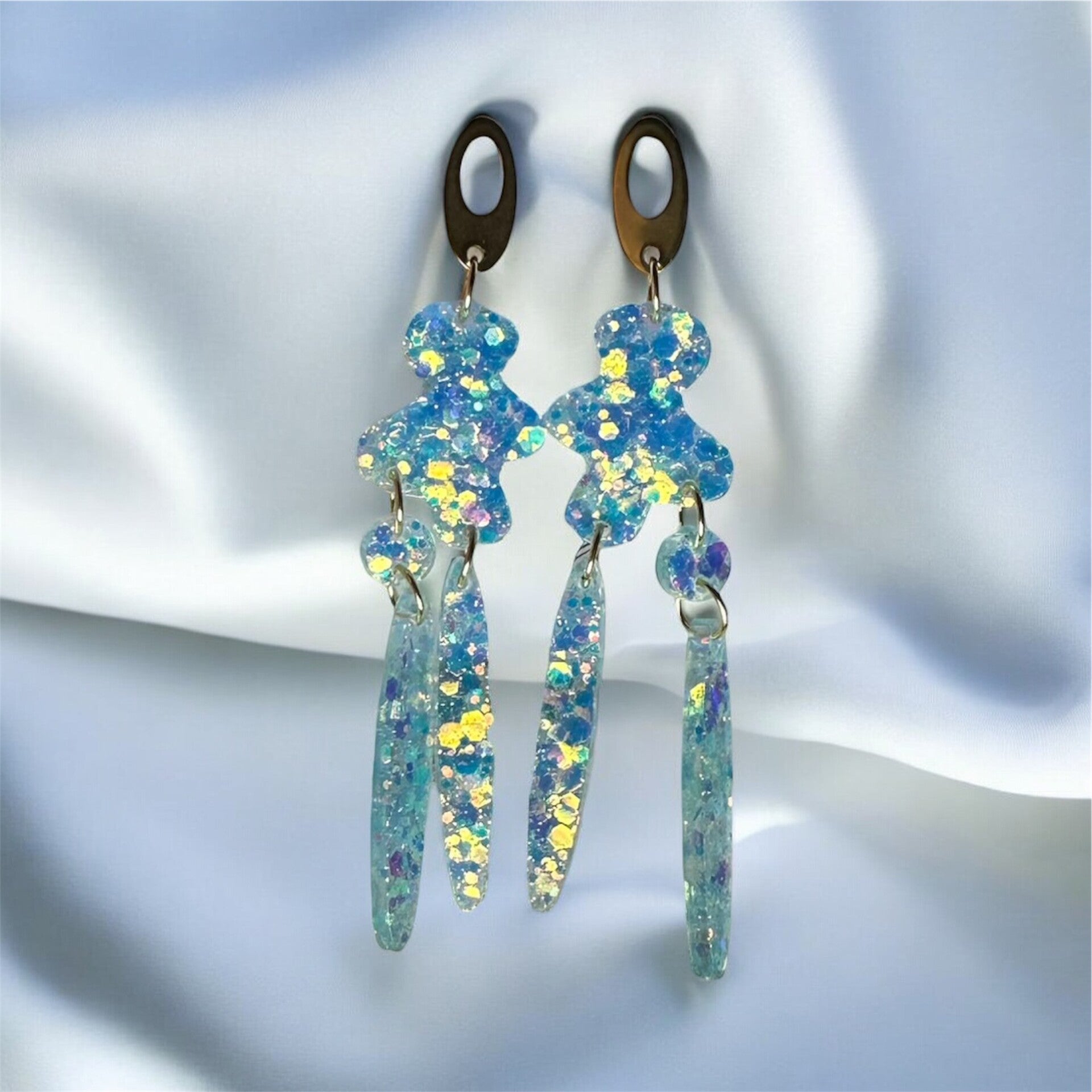Boucles d'oreilles faites à la main, en résine époxy, avec des apparats en acier inoxydable.